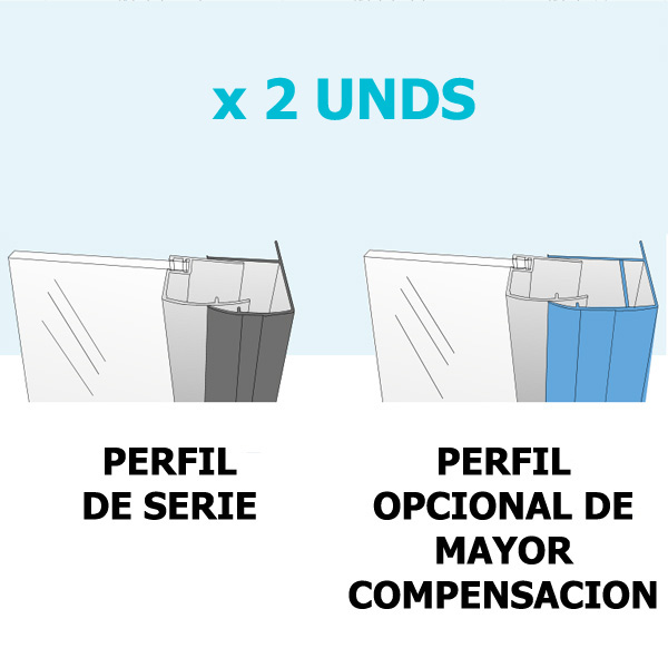El sistema de compensación y ajuste de la mampara es el que permite que podamos ajustar la mampara correctamente a las condiciones de la obra, adaptándose en mayor o menor medida a los posibles desniveles o descuadres que puedan existir así como a las medidas exactas de luz.